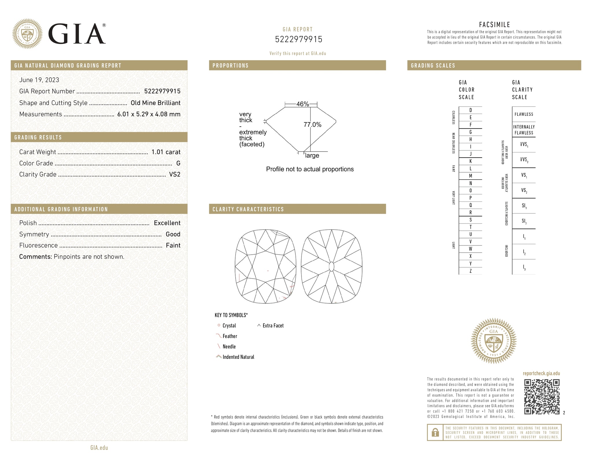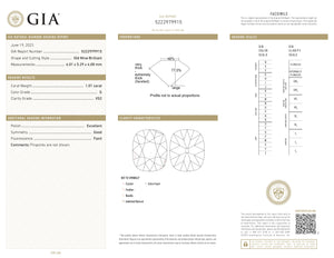 • Each of our diamonds are ethically sourced from superior rough and cut to exacting standards by our master gem cutters. This diamond is 1.01ct in a cushion shape old mine cut with a color of G and clarity of VS2. It is 6.01 - 5.29 x 4.08 with a depth of 77.1%.