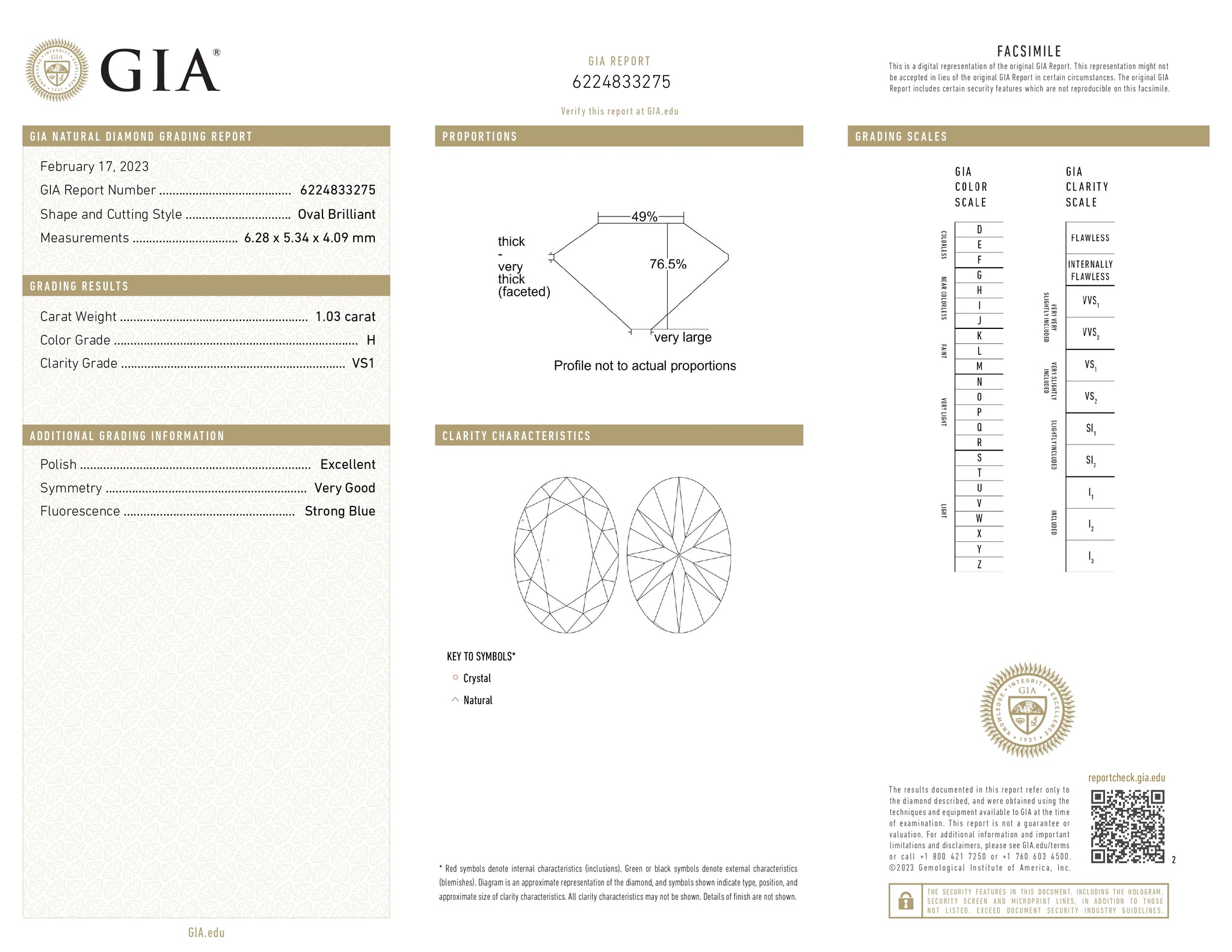 • Each of our diamonds are ethically sourced from superior rough and cut to exacting standards by our master gem cutters. This diamond is 1.03ct in an oval shape old mine cut with a color of H and clarity of VS1. It is 6.28 - 5.34 x 4.09 with a depth of 76.6%.