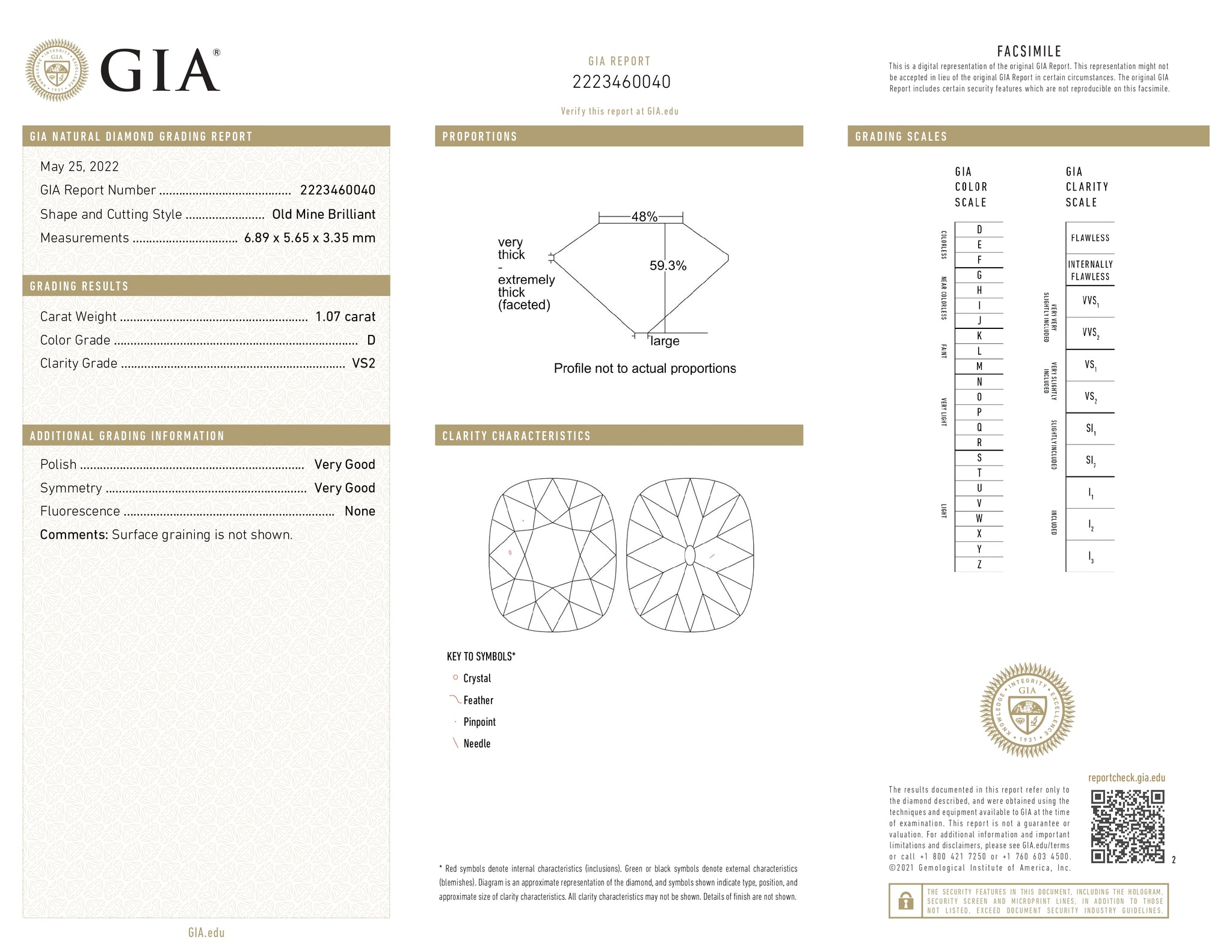 • Each of our diamonds are ethically sourced from superior rough and cut to exacting standards by our master gem cutters. This diamond is 1.07ct in a cushion shape old mine cut with a color of D and clarity of VS2. It is 6.89 - 5.65 x 3.35 with a depth of 59.3%.