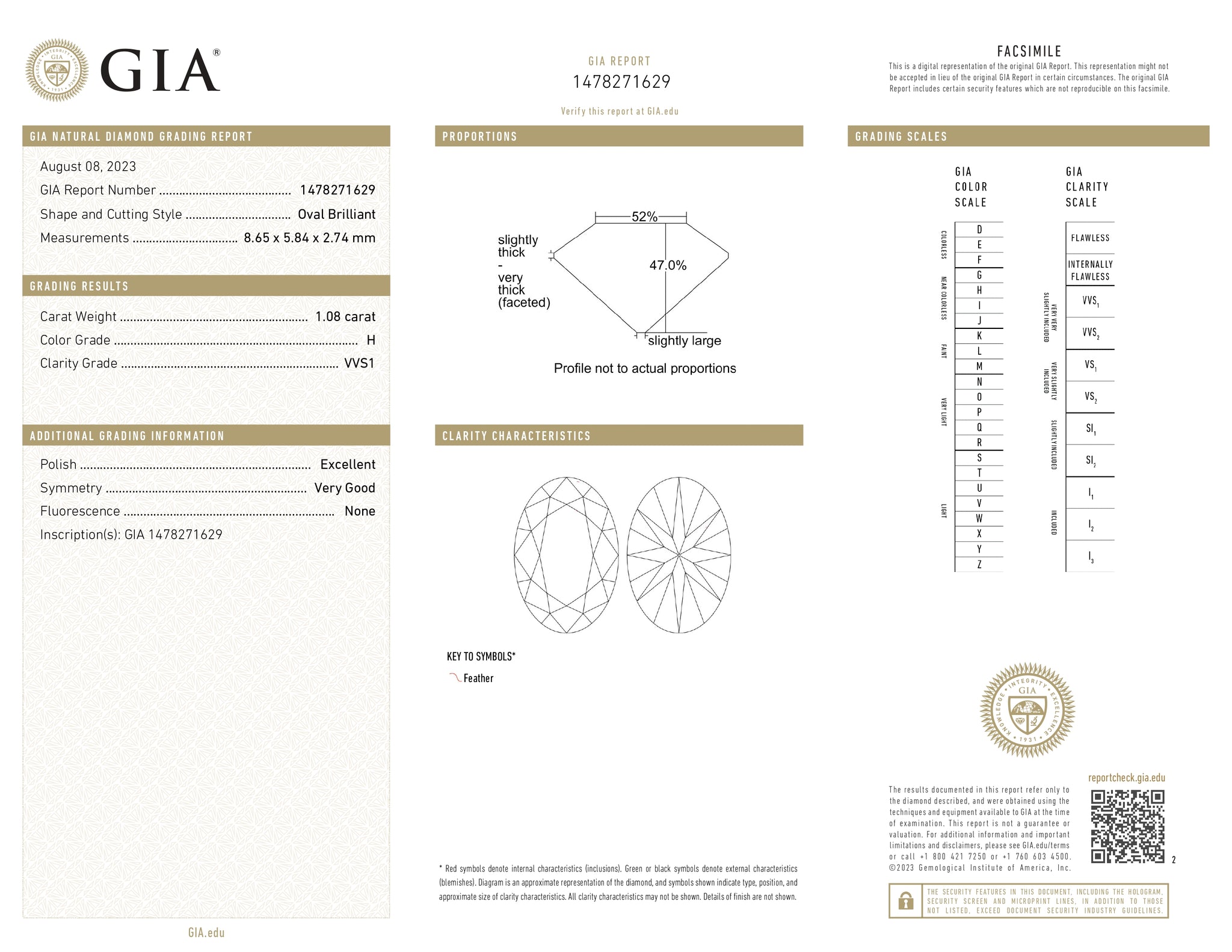 • Each of our diamonds are ethically sourced from superior rough and cut to exacting standards by our master gem cutters. This diamond is 1.08ct in an oval shape old mine cut with a color of H and clarity of VVS1. It is 8.65 - 5.84 x 2.74 with a depth of 46.9%.