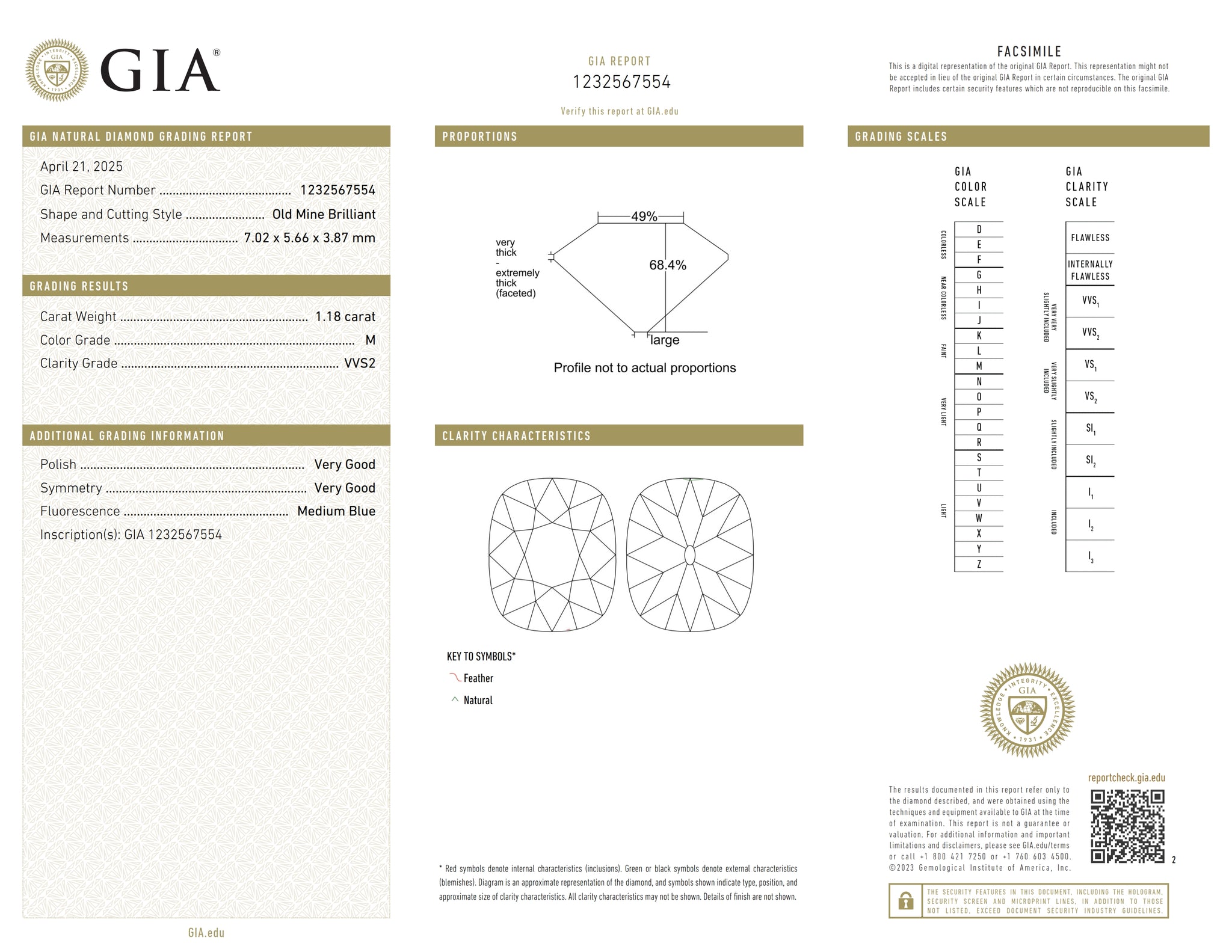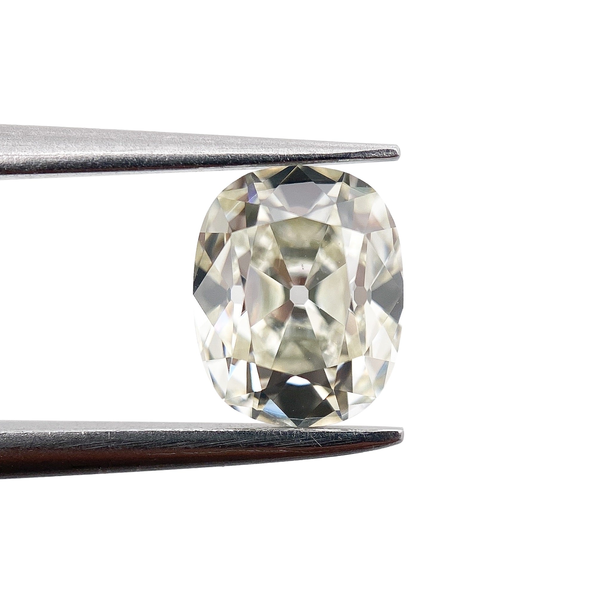 • Each of our diamonds are ethically sourced from superior rough and cut to exacting standards by our master gem cutters. This diamond is 1.18ct in a cushion shape old mine cut with a color of M and clarity of VVS2. It is 7.02 - 5.66 x 3.87 with a depth of 68.4%.