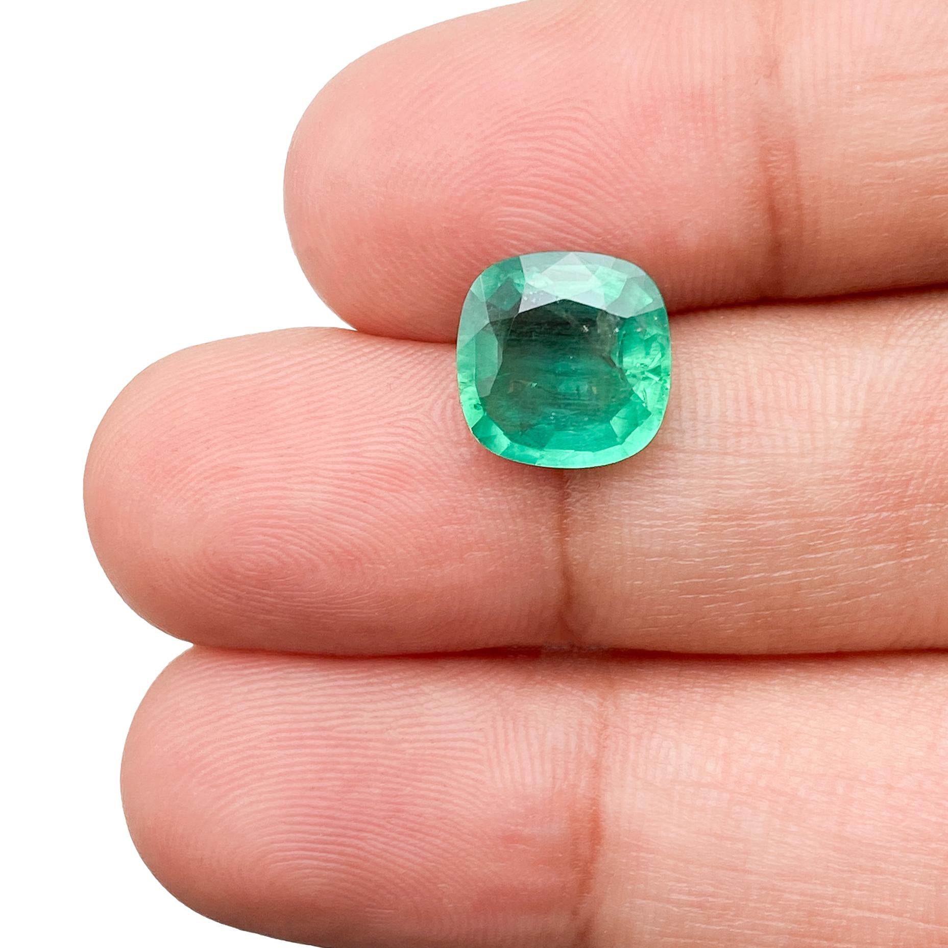 • Each of our gemstones are ethically sourced from superior rough and cut to exacting standards by our master gem cutters. This Emerald is 2.09ct in a cushion shape brilliant cut measuring 8.85 - 8.79 x 4.03 with a depth of 45.8%.