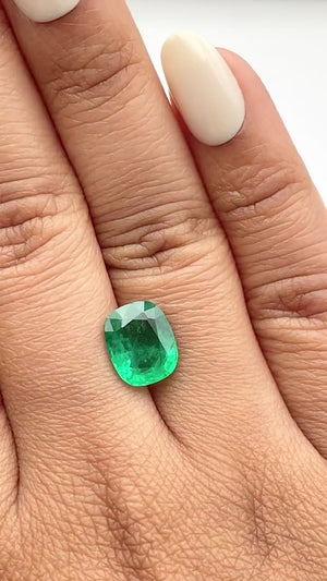 • Each of our gemstones are ethically sourced from superior rough and cut to exacting standards by our master gem cutters. This Emerald is 2.48ct in a cushion shape brilliant cut measuring 9.84 - 8.04 x 4.62 with a depth of 57.5%.