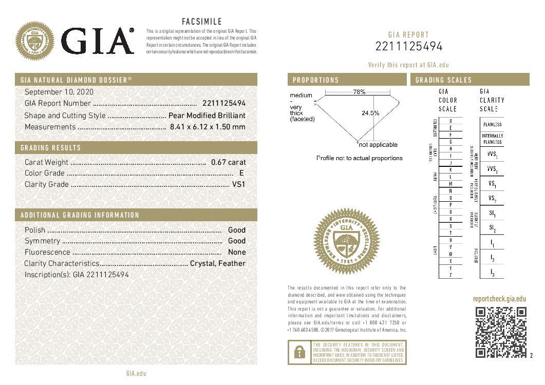 • Each of our diamonds are ethically sourced from superior rough and cut to exacting standards by our master gem cutters. This diamond is 0.67ct in a pear shape rose cut with a color of E and clarity of VS1. It is 8.41 - 6.12 x 1.50 with a depth of 24.5%.