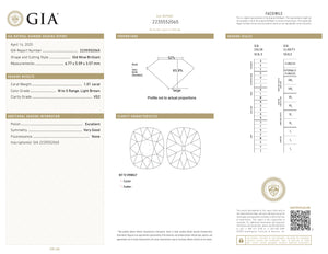 • Each of our diamonds are ethically sourced from superior rough and cut to exacting standards by our master gem cutters. This diamond is 1.01ct in a cushion shape old mine cut with a color of W-X and clarity of VS2. It is 6.77 - 5.59 x 3.57 with a depth of 63.9%.