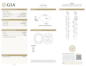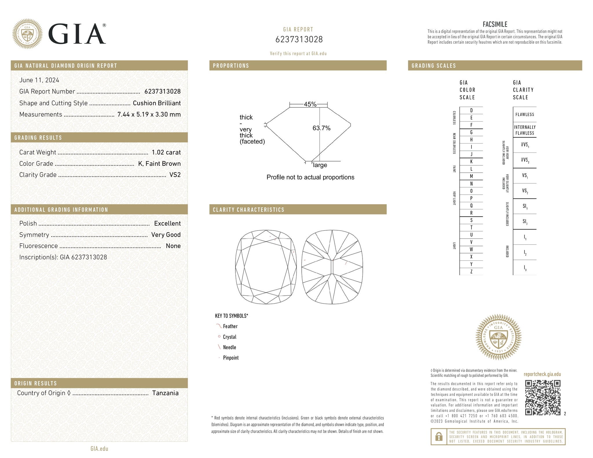 • Each of our diamonds are ethically sourced from superior rough and cut to exacting standards by our master gem cutters. This diamond is 1.02ct in a cushion shape old mine cut cut with a color of K and clarity of VS2. It is 7.43 - 5.19 x 3.30 with a depth of 63.6% and is certified by GIA. This diamond originates from Tanzania.