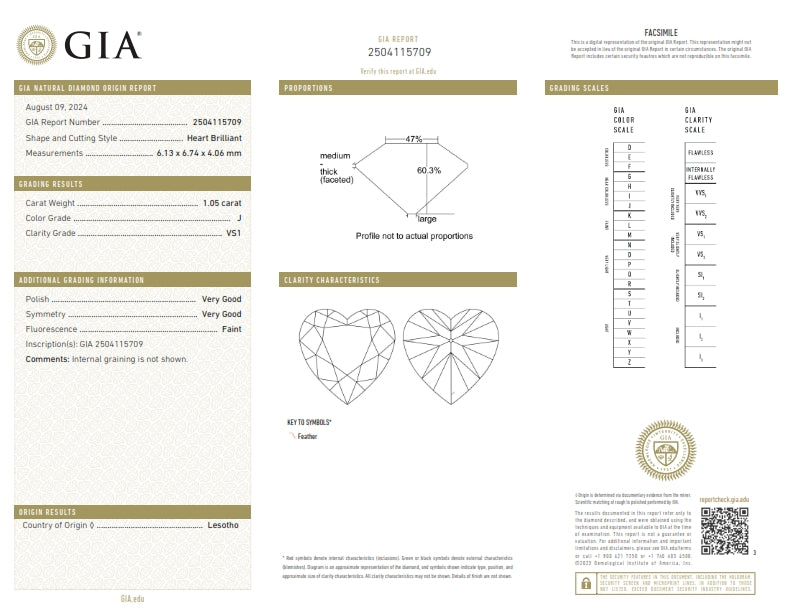 • Each of our diamonds are ethically sourced from superior rough and cut to exacting standards by our master gem cutters. This diamond is 1.05ct in a heart shape old mine cut cut with a color of J and clarity of VS1. It is 6.13 - 6.74 x 4.06 with a depth of 60.2% and is certified by GIA. This diamond originates from Lesotho.