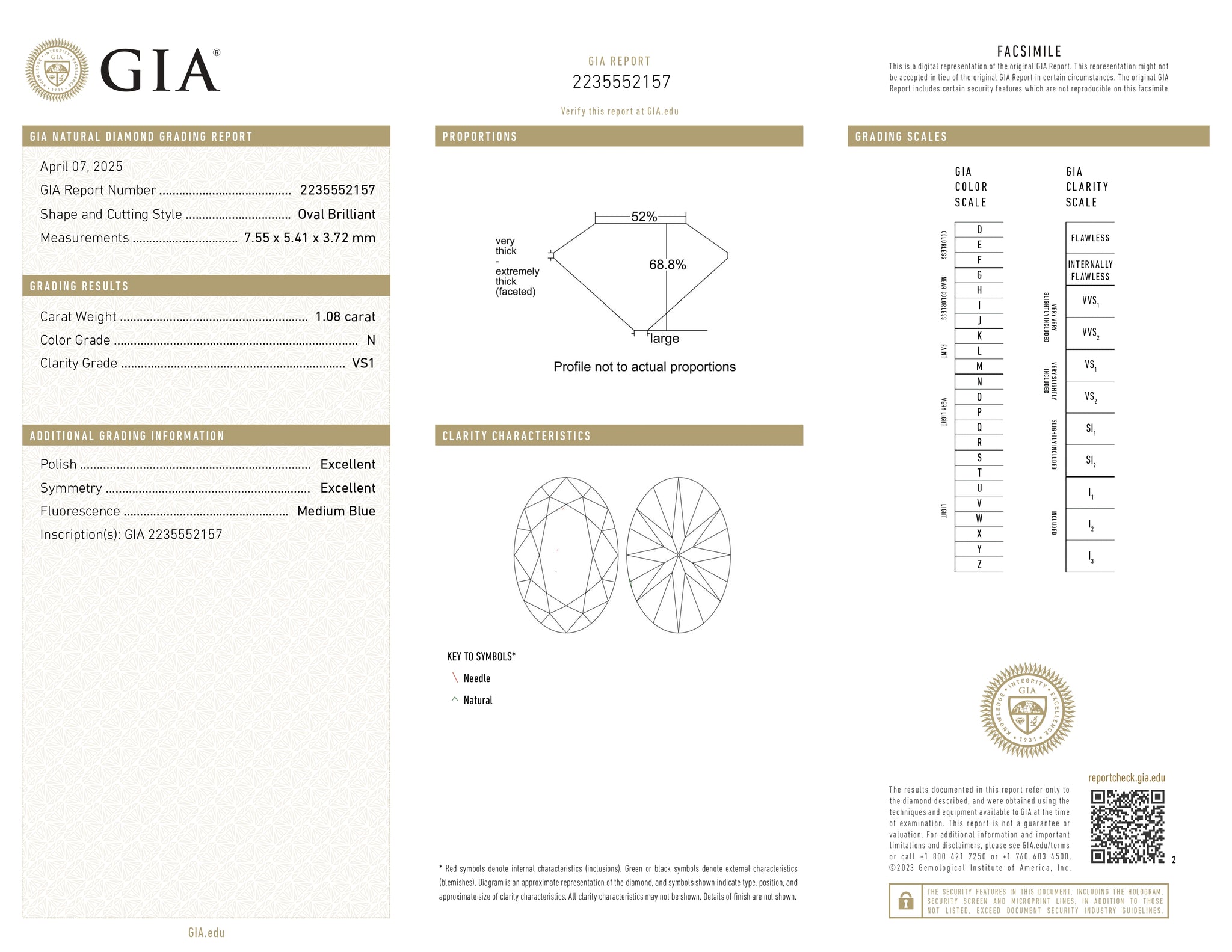 • Each of our diamonds are ethically sourced from superior rough and cut to exacting standards by our master gem cutters. This diamond is 1.08ct in an oval shape old mine cut with a color of N and clarity of VS1. It is 7.55 - 5.41 x 3.72 with a depth of 68.8%.
