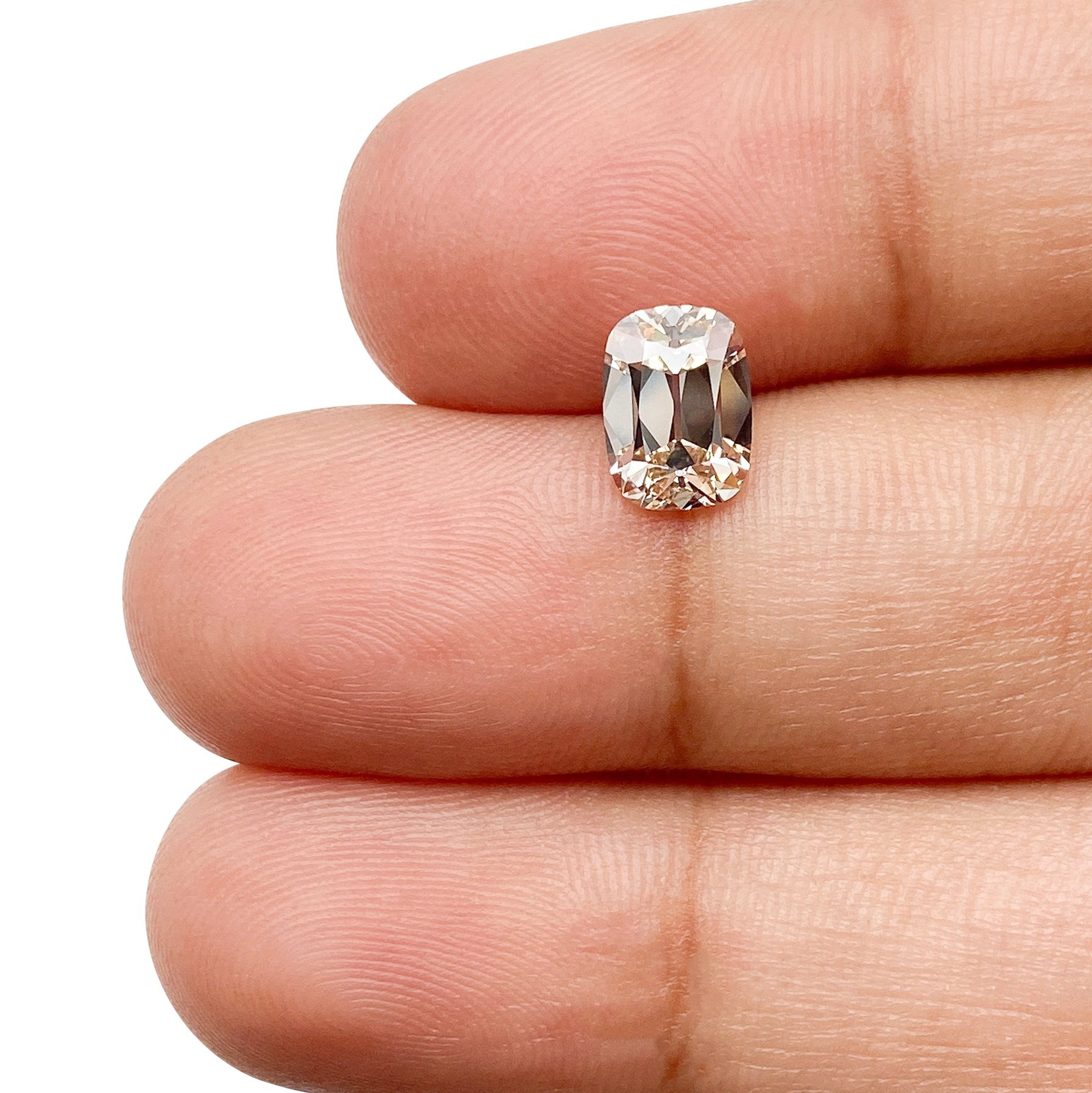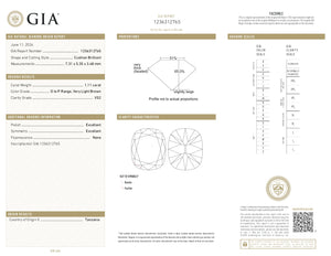 • Each of our diamonds are ethically sourced from superior rough and cut to exacting standards by our master gem cutters. This diamond is 1.11ct in a cushion shape old mine cut cut with a color of O-P and clarity of VS2. It is 7.31 - 5.35 x 3.48 with a depth of 65% and is certified by GIA. This diamond originates from Tanzania.