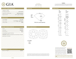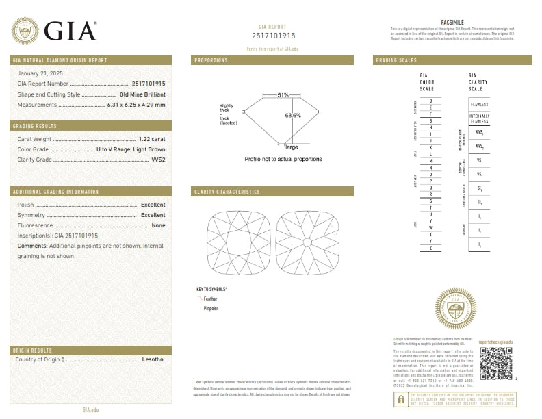 • Each of our diamonds are ethically sourced from superior rough and cut to exacting standards by our master gem cutters. This diamond is 1.22ct in a cushion shape old mine cut cut with a color of U-V and clarity of VVS2. It is 6.31 - 6.25 x 4.29 with a depth of 68.6% and is certified by GIA. This diamond originates from Lesotho.