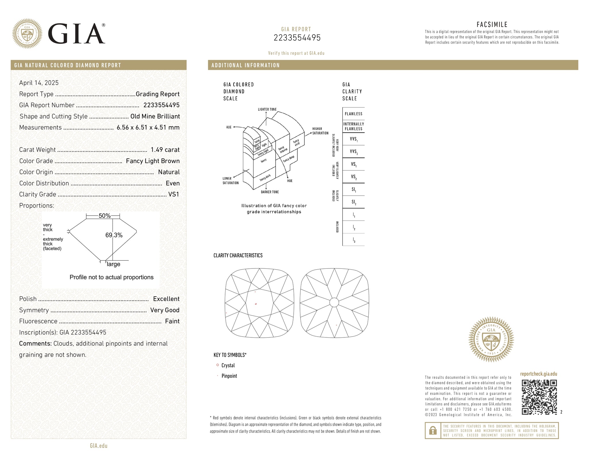 • Each of our diamonds are ethically sourced from superior rough and cut to exacting standards by our master gem cutters. This diamond is 1.49ct in a cushion shape old mine cut with a color of Light brown and clarity of VS1. It is 6.56 - 6.51 x 4.51 with a depth of 69.3%.