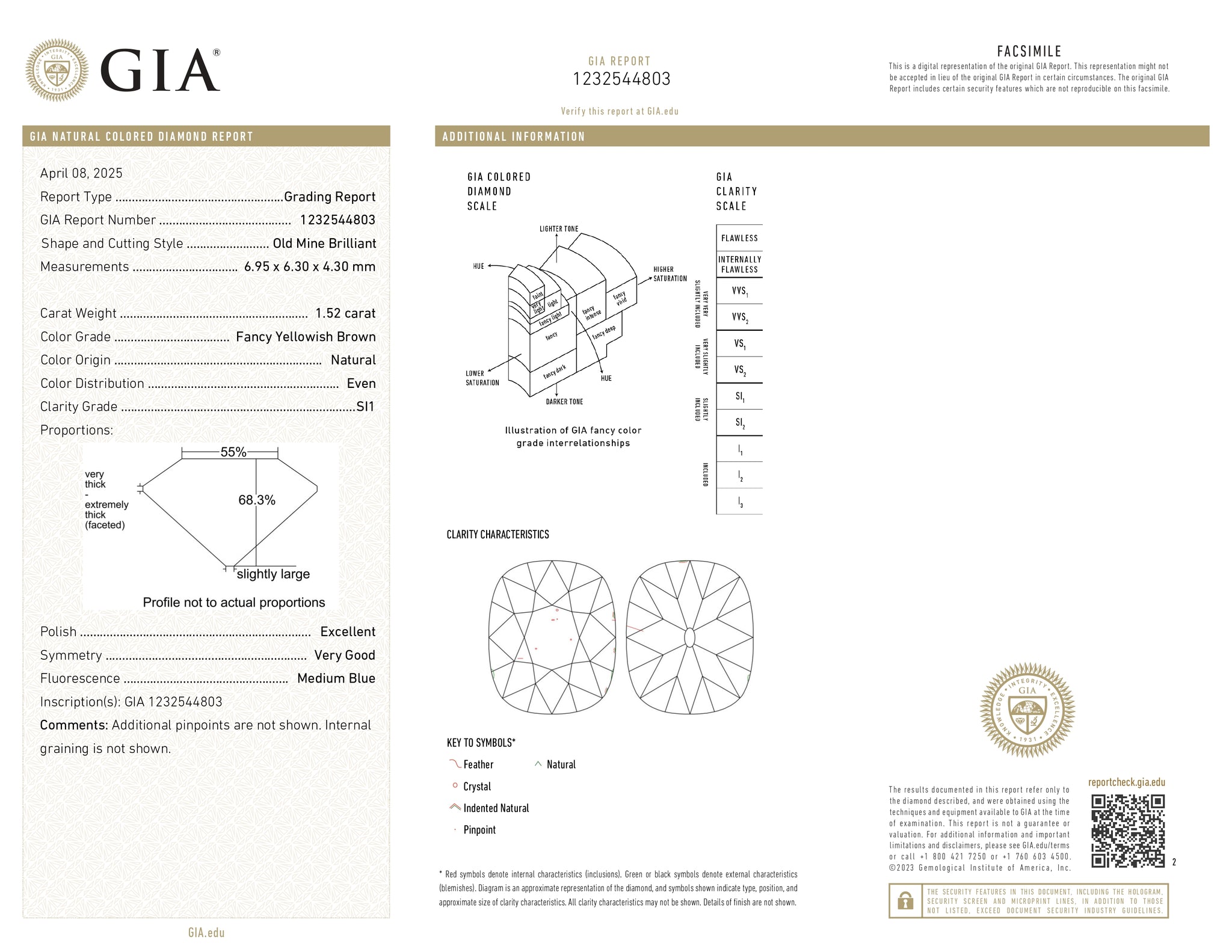 • Each of our diamonds are ethically sourced from superior rough and cut to exacting standards by our master gem cutters. This diamond is 1.52ct in a cushion shape old mine cut with a color of Champagne and clarity of SI1. It is 6.95 - 6.30 x 4.30 with a depth of 68.3%.