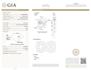 • Each of our diamonds are ethically sourced from superior rough and cut to exacting standards by our master gem cutters. This diamond is 2.76ct in a cushion shape old mine cut with a color of Cognac and clarity of VS2. It is 8.77 - 7.96 x 5.41 with a depth of 68%.
