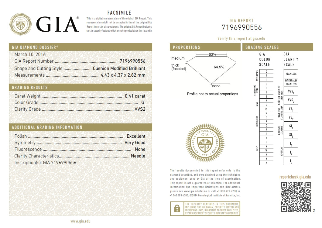 • Each of our diamonds are ethically sourced from superior rough and cut to exacting standards by our master gem cutters. This diamond is 0.41ct in a cushion shape brilliant cut with a color of G and clarity of VVS2. It is 4.43 - 4.37 x 2.82 with a depth of 64.5%.