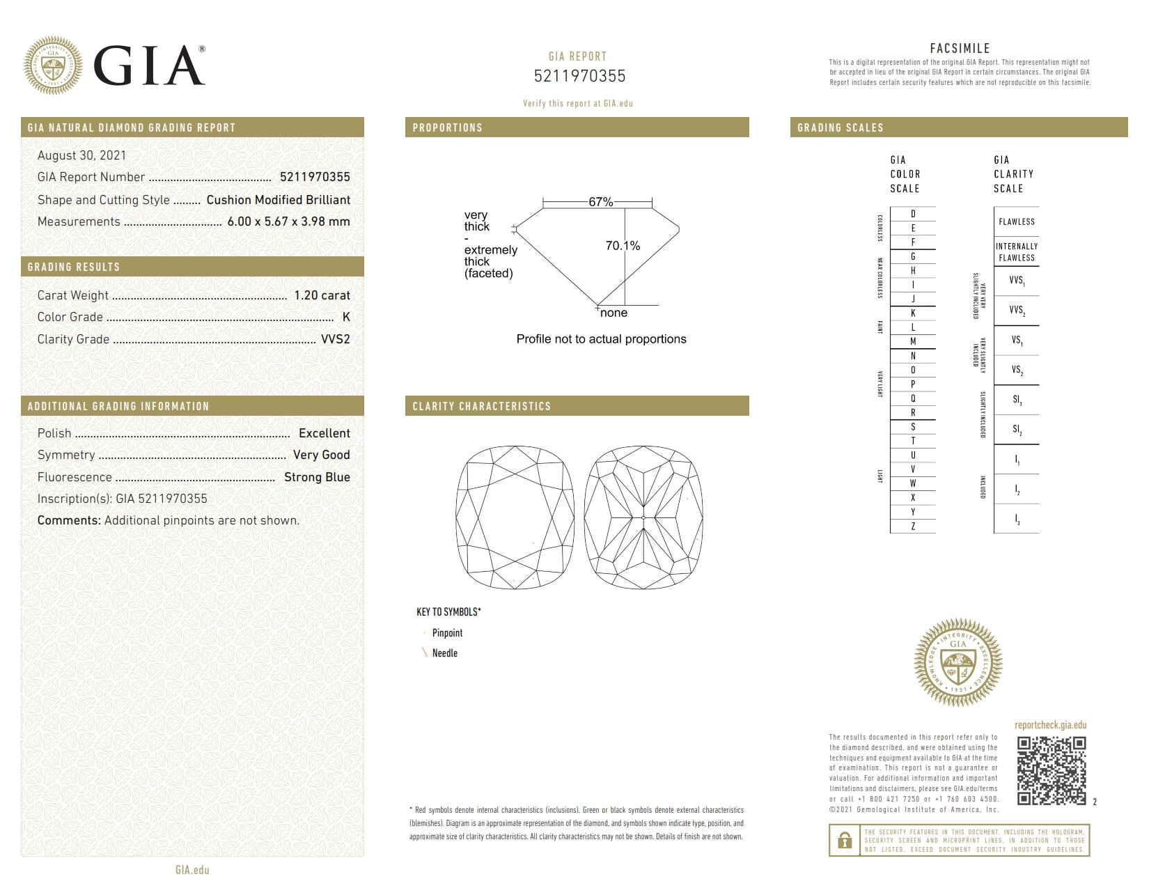 • Each of our diamonds are ethically sourced from superior rough and cut to exacting standards by our master gem cutters. This diamond is 1.20ct in a cushion shape brilliant cut with a color of K and clarity of VVS2. It is 6.00 - 5.67 x 3.98 with a depth of 70.2%.