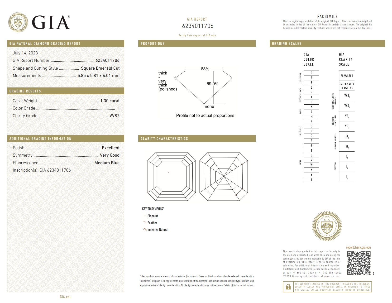 • Each of our diamonds are ethically sourced from superior rough and cut to exacting standards by our master gem cutters. This diamond is 1.30ct in an asscher shape step cut with a color of I and clarity of VVS2. It is 5.85 - 5.81 x 4.01 with a depth of 69%.