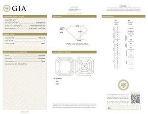 • Each of our diamonds are ethically sourced from superior rough and cut to exacting standards by our master gem cutters. This diamond is 1.70ct in an asscher shape step cut with a color of J and clarity of VVS2. It is 6.54 - 6.51 x 4.41 with a depth of 67.7%.
