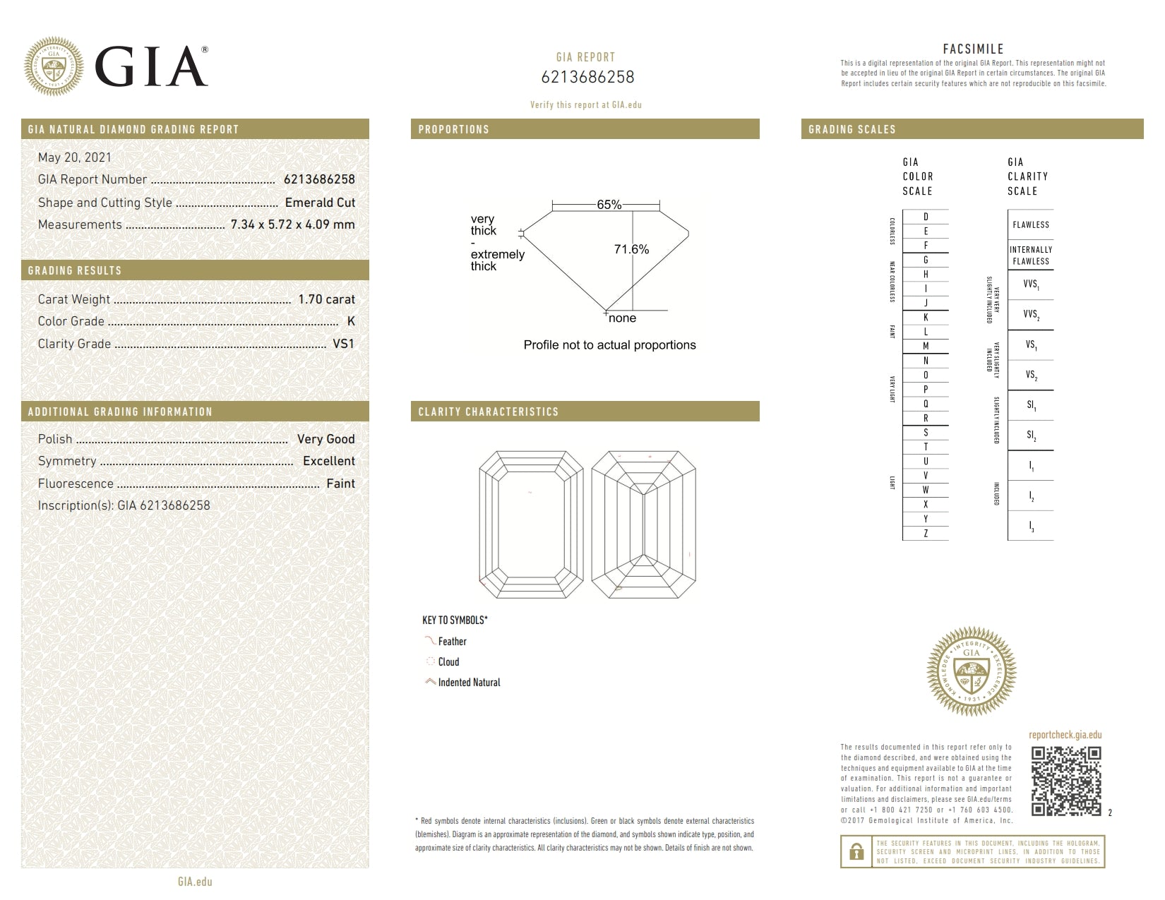 • Each of our diamonds are ethically sourced from superior rough and cut to exacting standards by our master gem cutters. This diamond is 1.70ct in an emerald shape brilliant cut with a color of K and clarity of VS1. It is 7.34 - 5.72 x 4.09 with a depth of 71.5%.