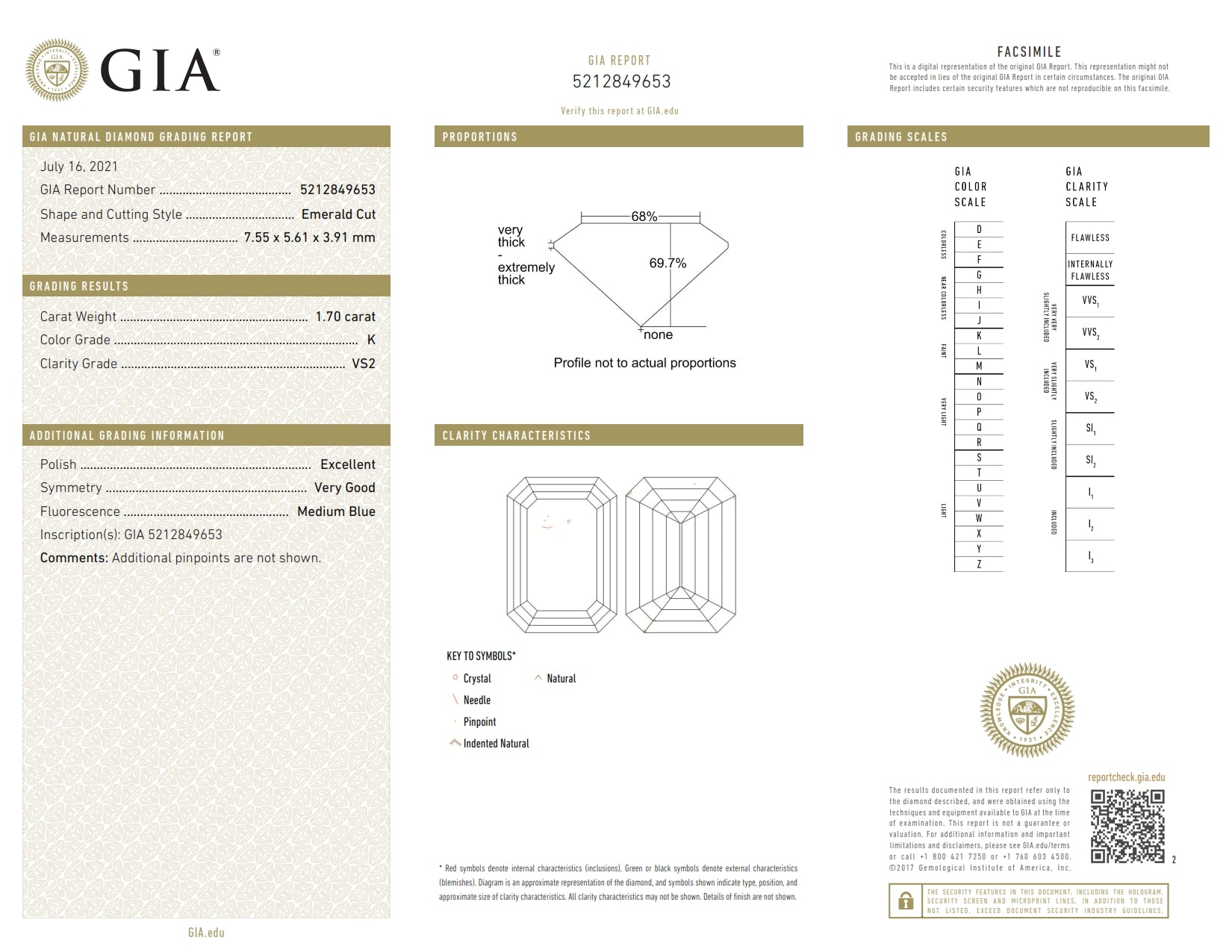 • Each of our diamonds are ethically sourced from superior rough and cut to exacting standards by our master gem cutters. This diamond is 1.70ct in an emerald shape brilliant cut with a color of K and clarity of VVS2. It is 7.55 - 5.61 x 3.91 with a depth of 69.7%.