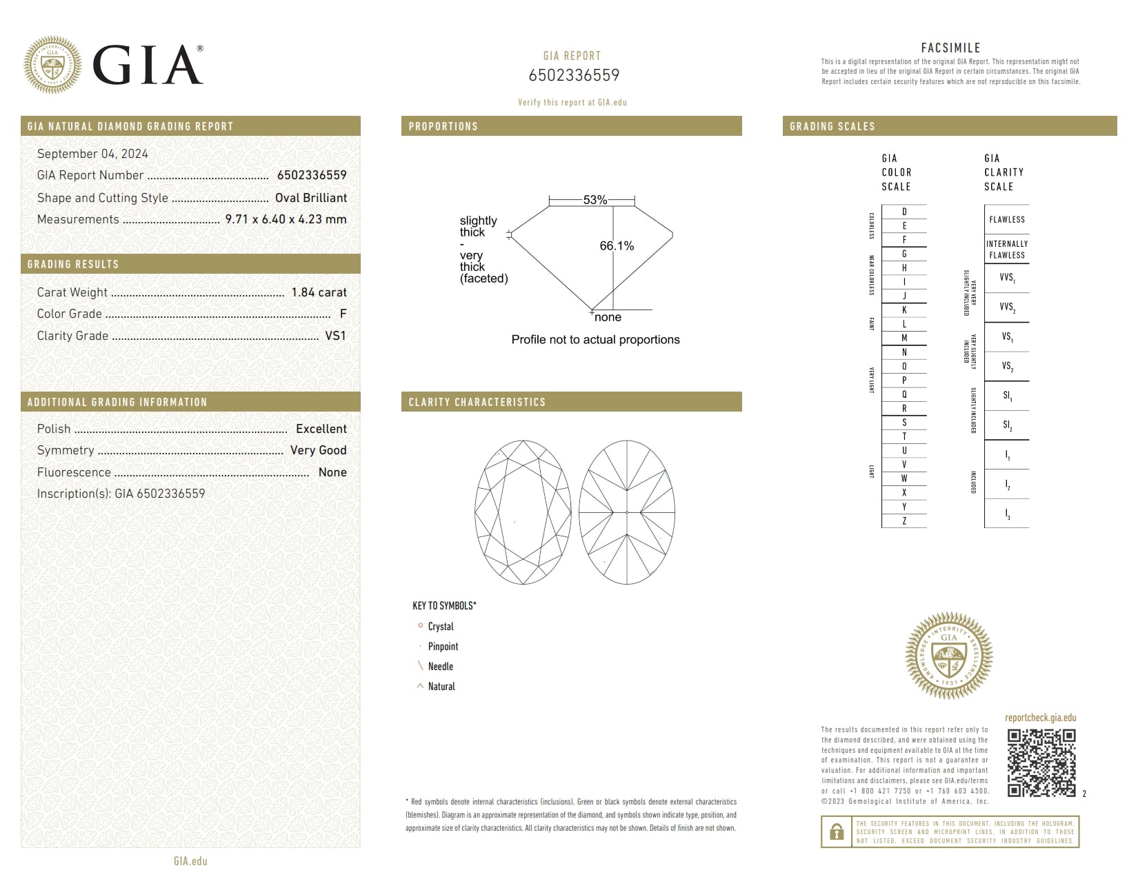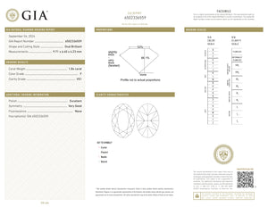 • Each of our diamonds are ethically sourced from superior rough and cut to exacting standards by our master gem cutters. This diamond is 1.84ct in an oval shape brilliant cut with a color of F and clarity of VS1. It is 9.71 - 6.40 x 4.23 with a depth of 66.1%.