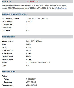1.54ct | D/I1 Cushion Shape Brilliant Cut Diamond (EGL USA)
