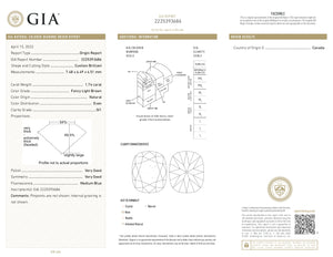 • Each of our diamonds are ethically sourced from superior rough and cut to exacting standards by our master gem cutters. This diamond is 1.74ct in a cushion shape old mine cut with a color of Light brown and clarity of SI1. It is 7.48 - 6.49 x 4.51 with a depth of 69.5%.