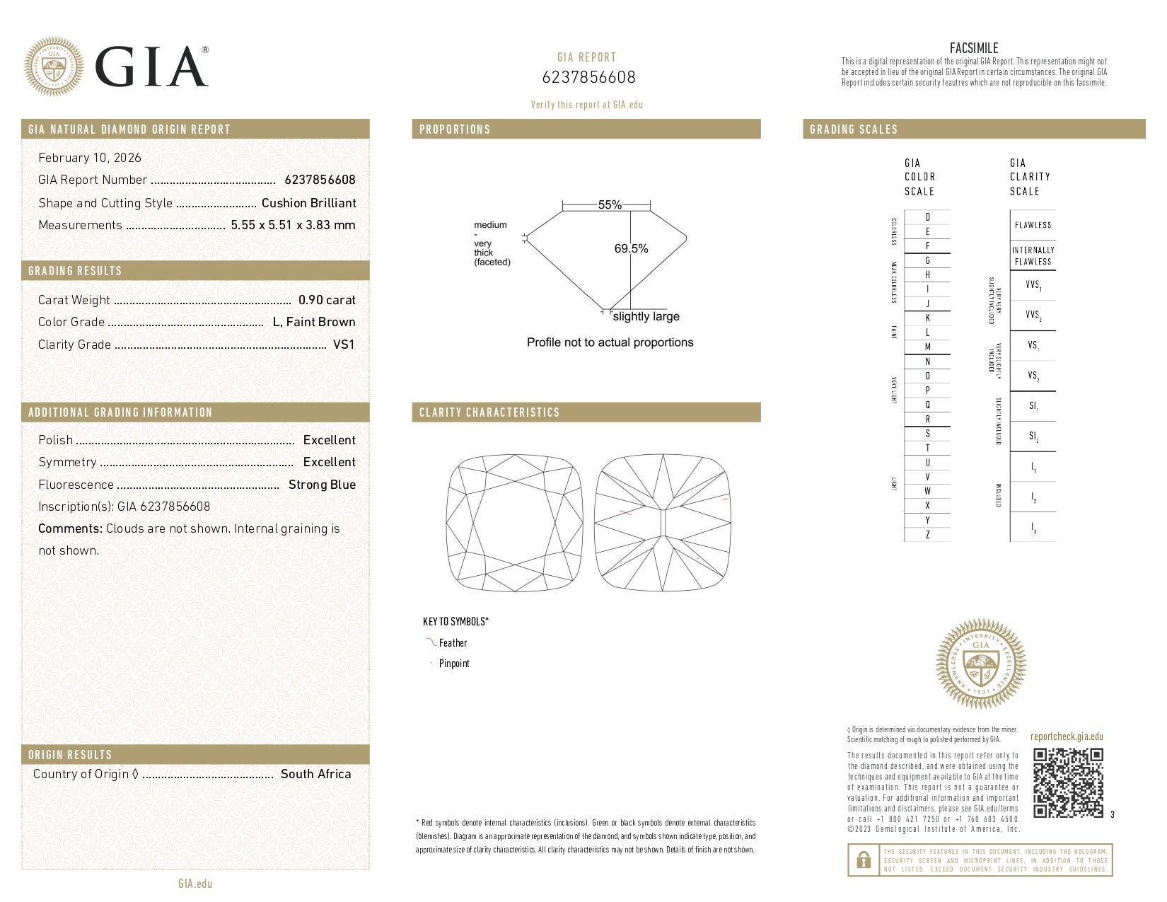 • Each of our diamonds are ethically sourced from superior rough and cut to exacting standards by our master gem cutters. This diamond is 0.90ct in a cushion shape old mine cut cut with a color of L and clarity of VS1. It is 5.55 - 5.51 x 3.83 with a depth of 69.5% and is certified by GIA. This diamond originates from South Africa.