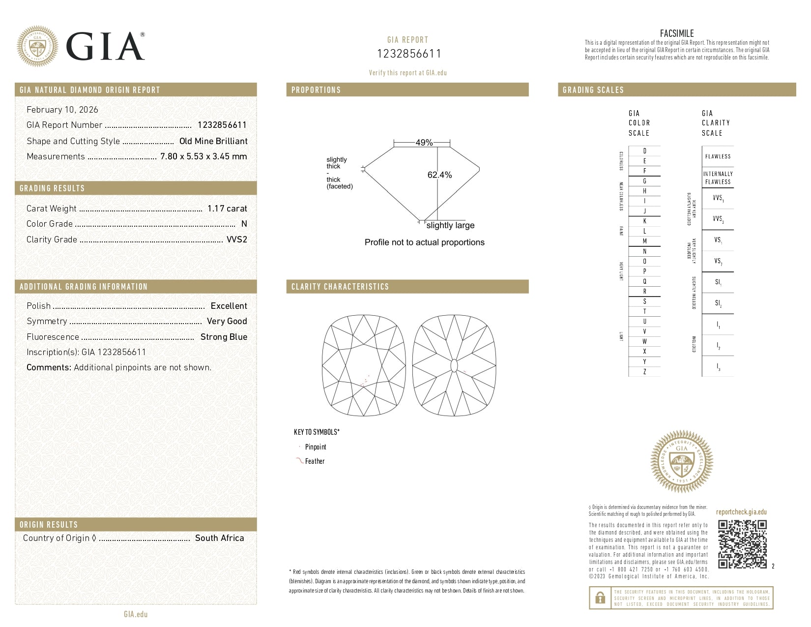 • Each of our diamonds are ethically sourced from superior rough and cut to exacting standards by our master gem cutters. This diamond is 1.17ct in a cushion shape old mine cut cut with a color of N and clarity of VVS2. It is 7.80 - 5.53 x 3.45 with a depth of 62.4% and is certified by GIA. This diamond originates from South Africa.