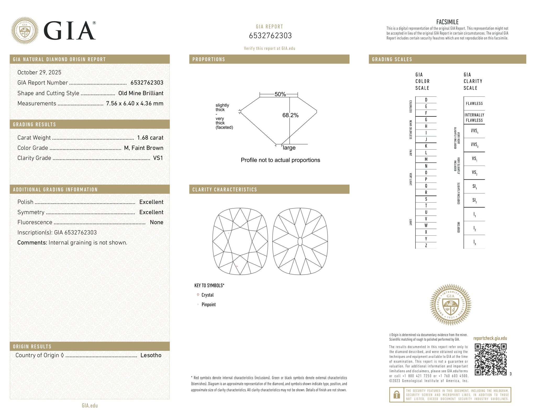 • Each of our diamonds are ethically sourced from superior rough and cut to exacting standards by our master gem cutters. This diamond is 1.68ct in a cushion shape old mine cut cut with a color of M and clarity of VS1. It is 7.56 - 6.40 x 4.36 with a depth of 68.1% and is certified by GIA. This diamond originates from Lesotho.
