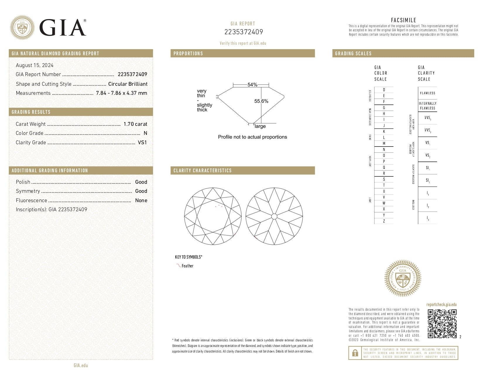 • Each of our diamonds are ethically sourced from superior rough and cut to exacting standards by our master gem cutters. This diamond is 1.70ct in a round shape brilliant cut with a color of N and clarity of VS1. It is 7.84 - 7.86 x 4.37 with a depth of 55.7%.