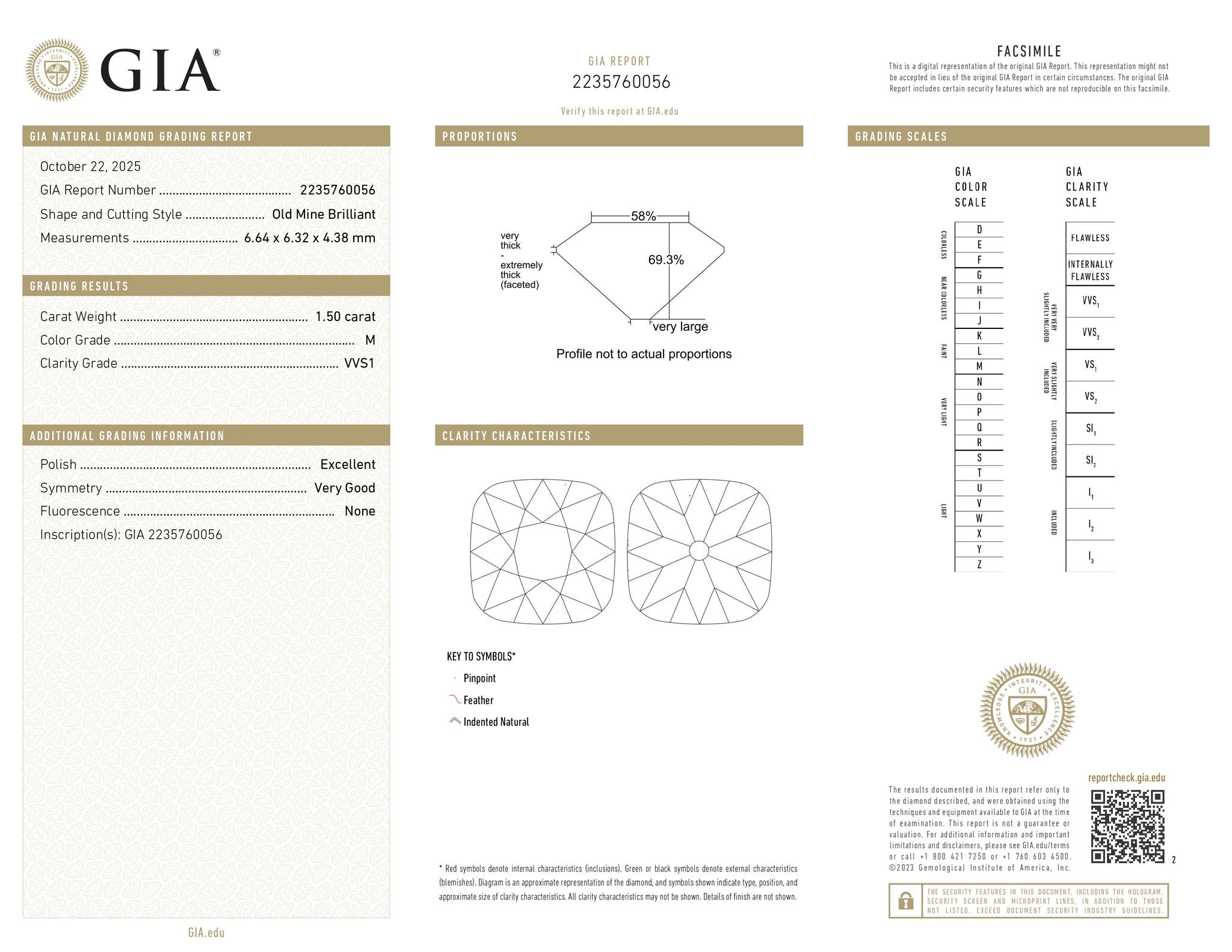 • Each of our diamonds are ethically sourced from superior rough and cut to exacting standards by our master gem cutters. This diamond is 1.50ct in a cushion shape old mine cut with a color of M and clarity of VVS1. It is 6.64 - 6.32 x 4.38 with a depth of 69.3%.