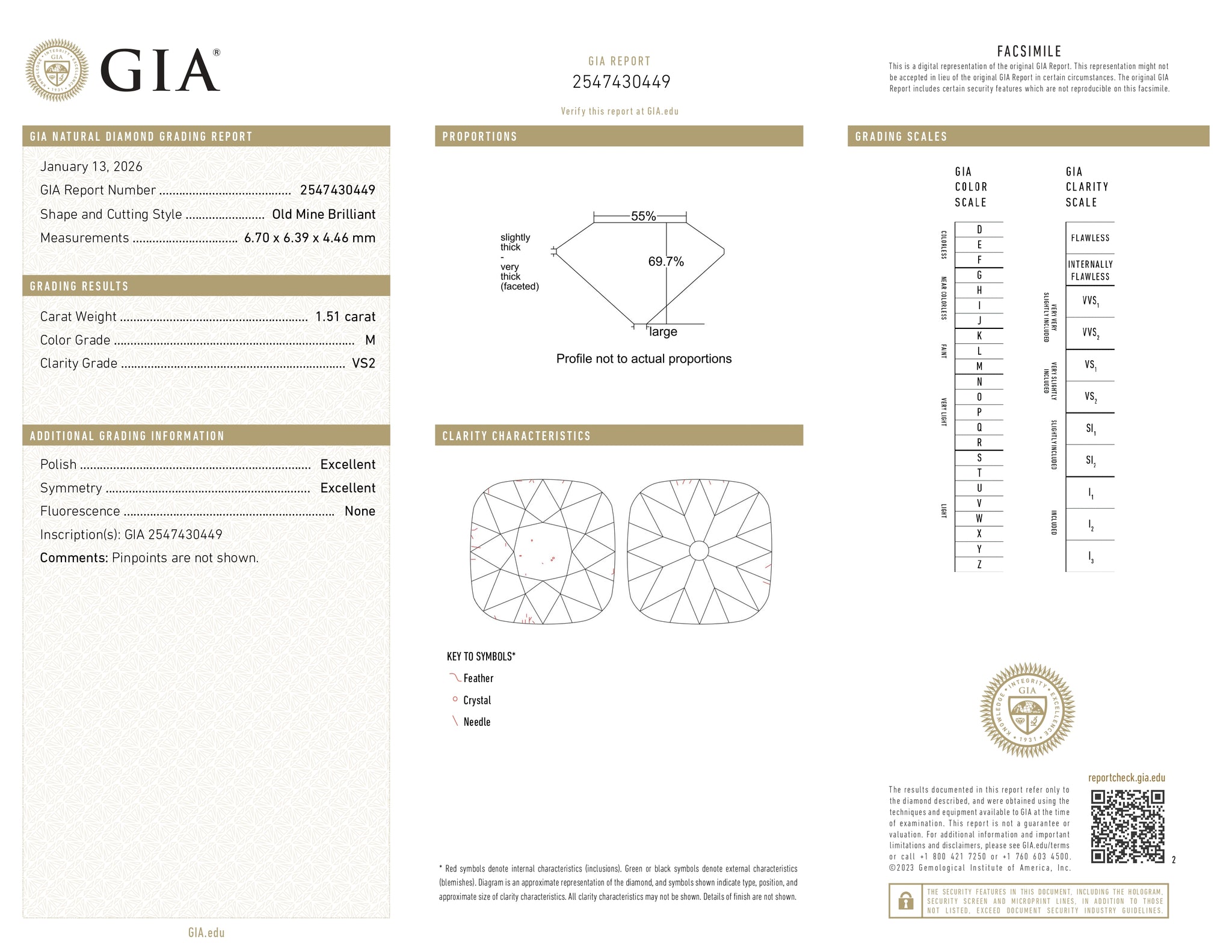 • Each of our diamonds are ethically sourced from superior rough and cut to exacting standards by our master gem cutters. This diamond is 1.51ct in a cushion shape old mine cut with a color of M and clarity of VS2. It is 6.70 - 6.39 x 4.46 with a depth of 69.7%.