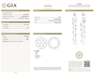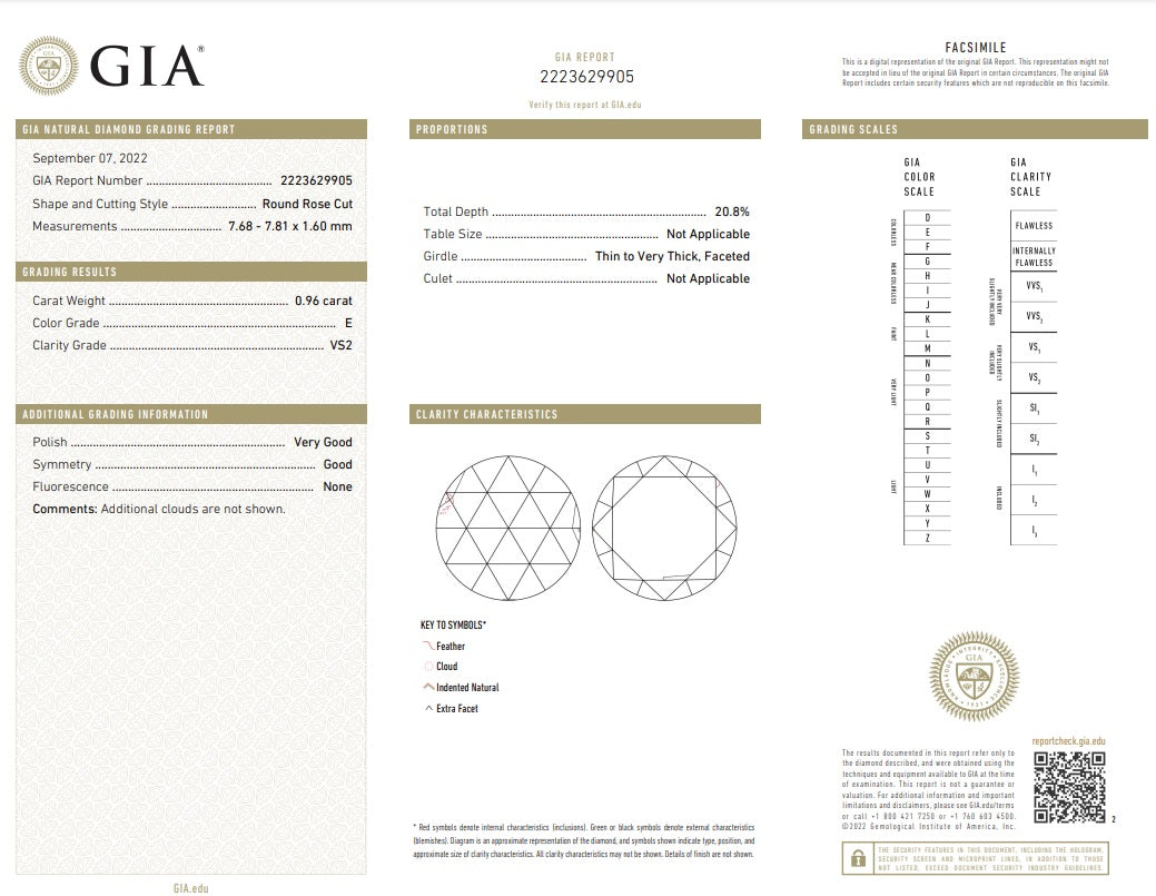 • Each of our diamonds are ethically sourced from superior rough and cut to exacting standards by our master gem cutters. This diamond is 0.96ct in a round shape rose cut with a color of E and clarity of VS2. It is 7.68 - 7.81 x 1.60 with a depth of 20.5%.