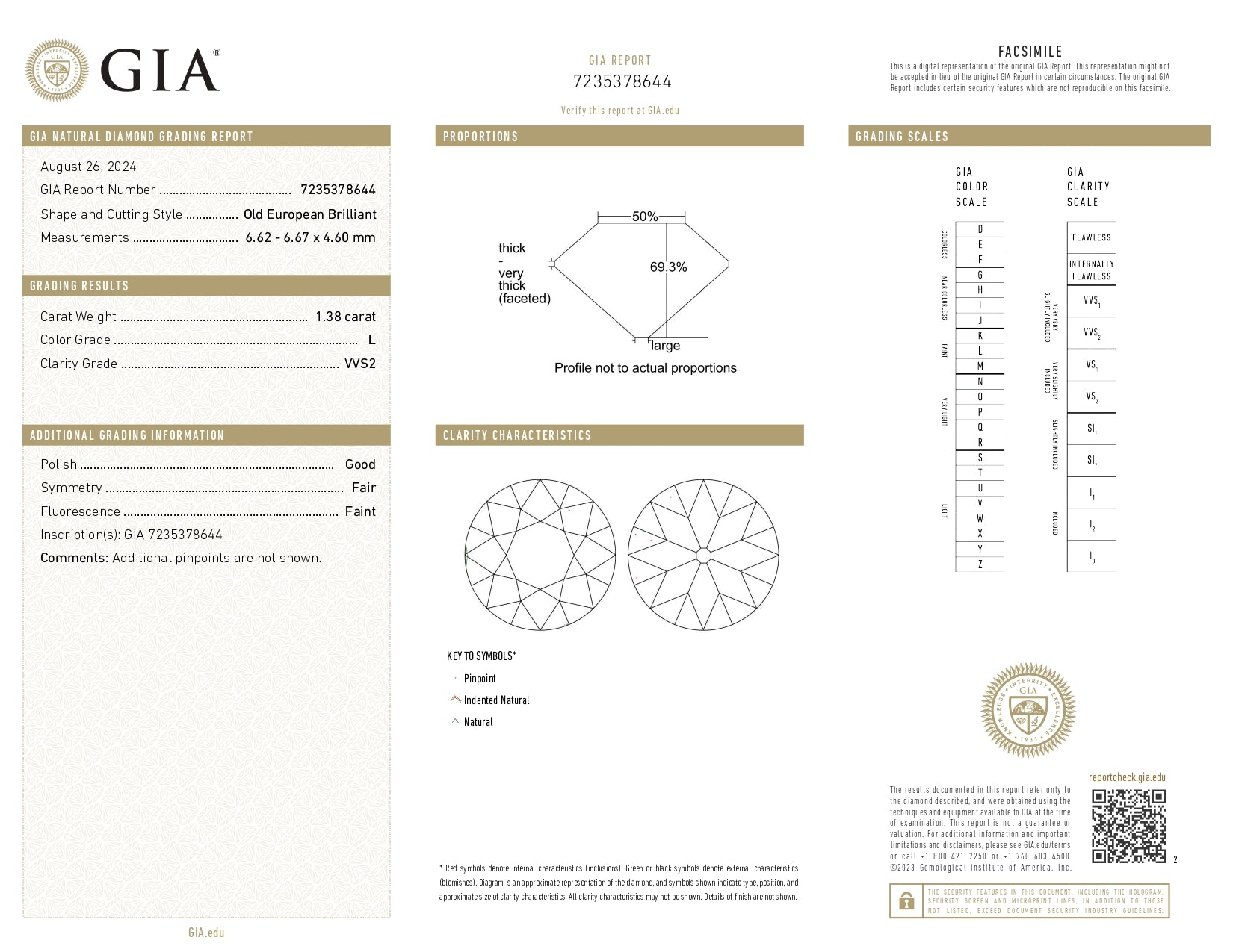 • Each of our diamonds are ethically sourced from superior rough and cut to exacting standards by our master gem cutters. This diamond is 1.38ct in a round shape old european cut with a color of L and clarity of VVS2. It is 6.62 - 6.67 x 4.60 with a depth of 69.2%.