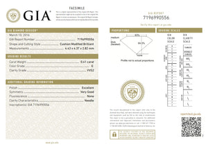 • Each of our diamonds are ethically sourced from superior rough and cut to exacting standards by our master gem cutters. This diamond is 0.41ct in a cushion shape brilliant cut with a color of G and clarity of VVS2. It is 4.43 - 4.37 x 2.82 with a depth of 64.5%.