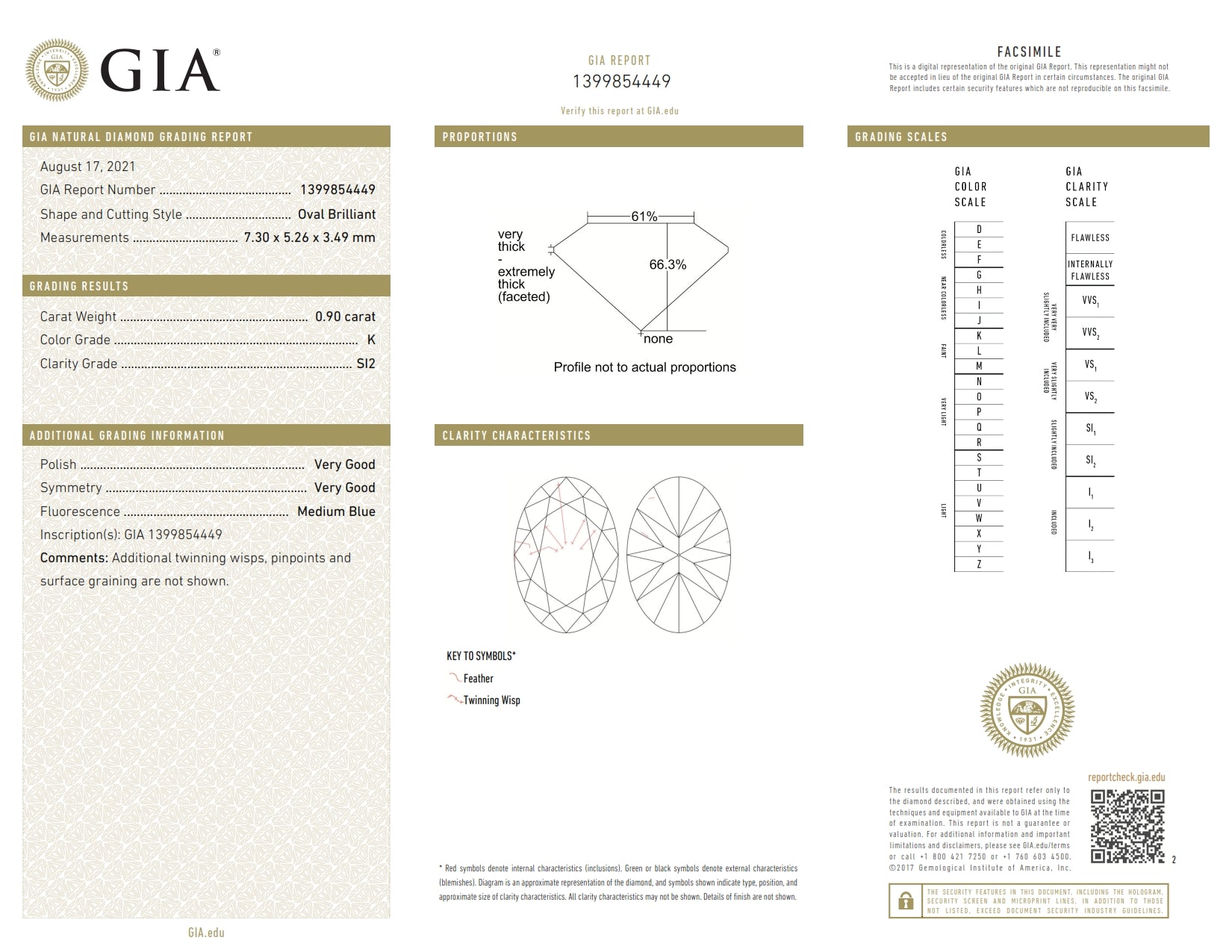 • Each of our diamonds are ethically sourced from superior rough and cut to exacting standards by our master gem cutters. This diamond is 0.90ct in an oval shape brilliant cut with a color of K and clarity of SI2. It is 7.30 - 5.26 x 3.49 with a depth of 66.3%.