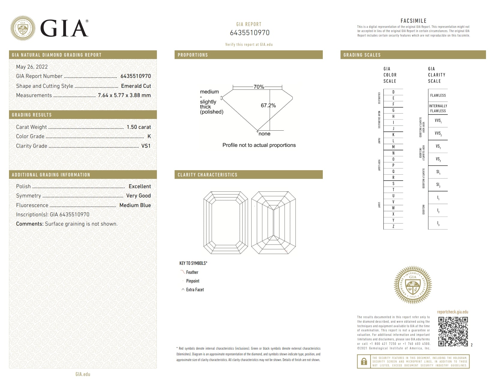 • Each of our diamonds are ethically sourced from superior rough and cut to exacting standards by our master gem cutters. This diamond is 1.50ct in an emerald shape brilliant cut with a color of K and clarity of VS1. It is 7.64 - 5.77 x 3.88 with a depth of 67.2%.