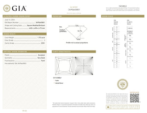 • Each of our diamonds are ethically sourced from superior rough and cut to exacting standards by our master gem cutters. This diamond is 1.70ct in a princess shape brilliant cut with a color of I and clarity of VVS1. It is 6.82 - 6.50 x 4.73 with a depth of 72.8%.
