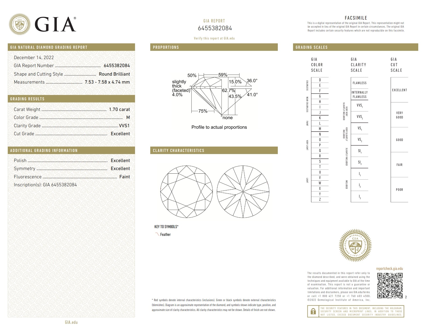 • Each of our diamonds are ethically sourced from superior rough and cut to exacting standards by our master gem cutters. This diamond is 1.70ct in a round shape brilliant cut with a color of M and clarity of VVS1. It is 7.53 - 7.58 x 4.74 with a depth of 62.7%.