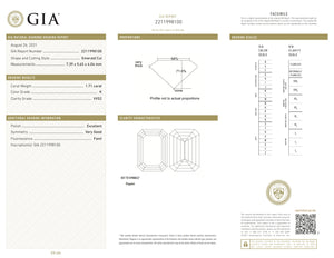 • Each of our diamonds are ethically sourced from superior rough and cut to exacting standards by our master gem cutters. This diamond is 1.71ct in an emerald shape brilliant cut with a color of K and clarity of VVS2. It is 7.39 - 5.65 x 4.04 with a depth of 71.5%.