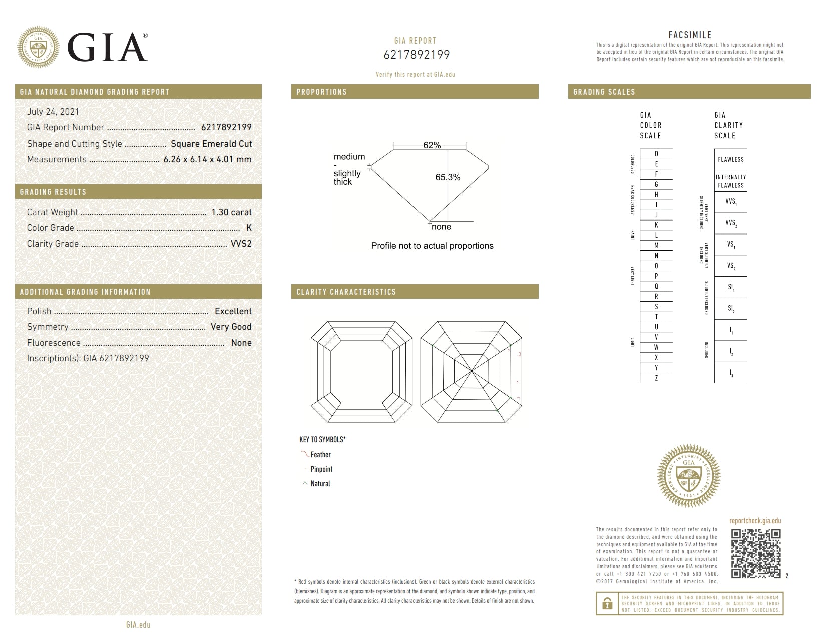 • Each of our diamonds are ethically sourced from superior rough and cut to exacting standards by our master gem cutters. This diamond is 1.30ct in an asscher shape step cut with a color of K and clarity of VVS2. It is 6.26 - 6.14 x 4.01 with a depth of 65.3%.