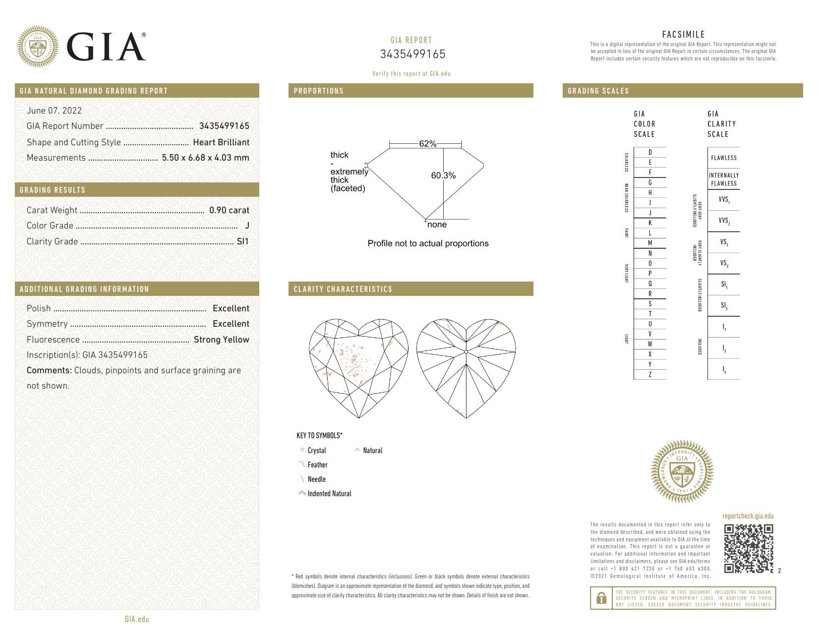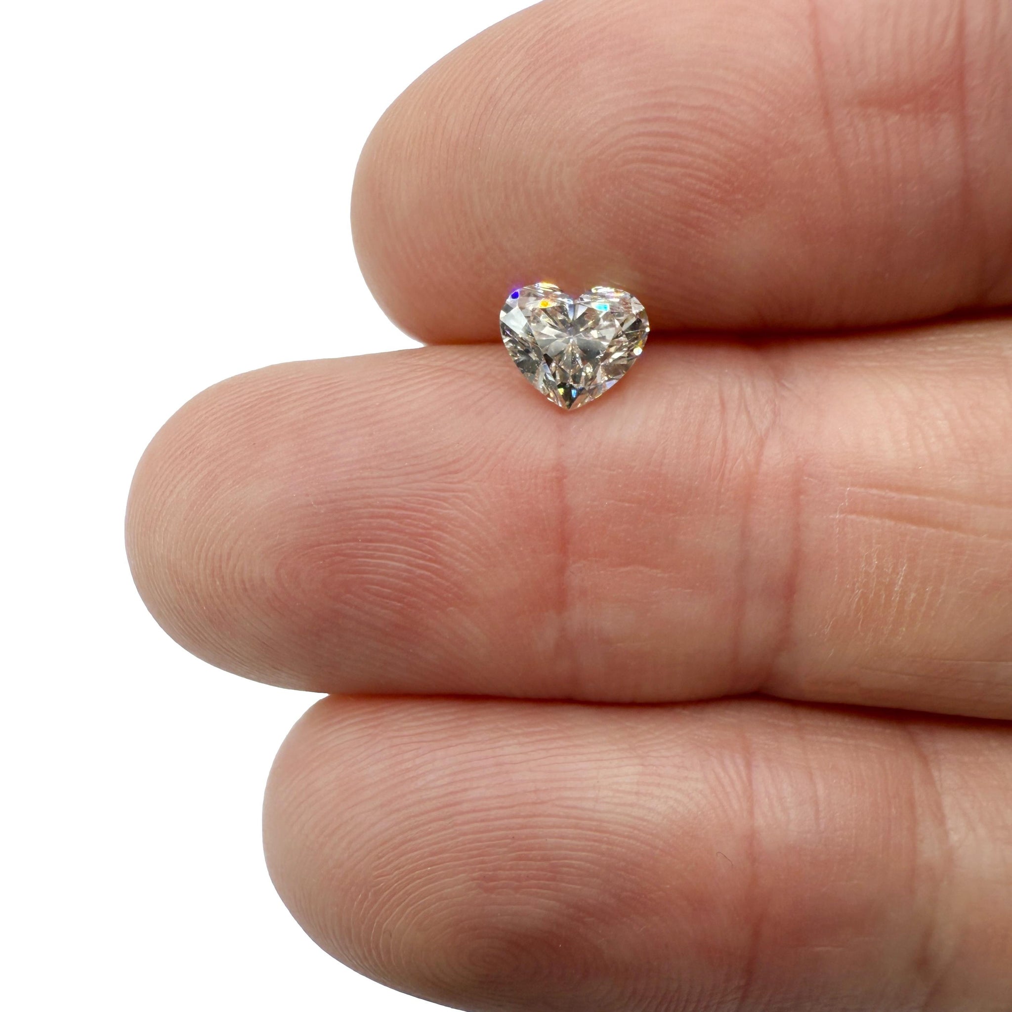 • Each of our diamonds are ethically sourced from superior rough and cut to exacting standards by our master gem cutters. This diamond is 0.90ct in a heart shape brilliant cut with a color of J and clarity of SI1. It is 5.50 - 6.68 x 4.03 with a depth of 60.3%.