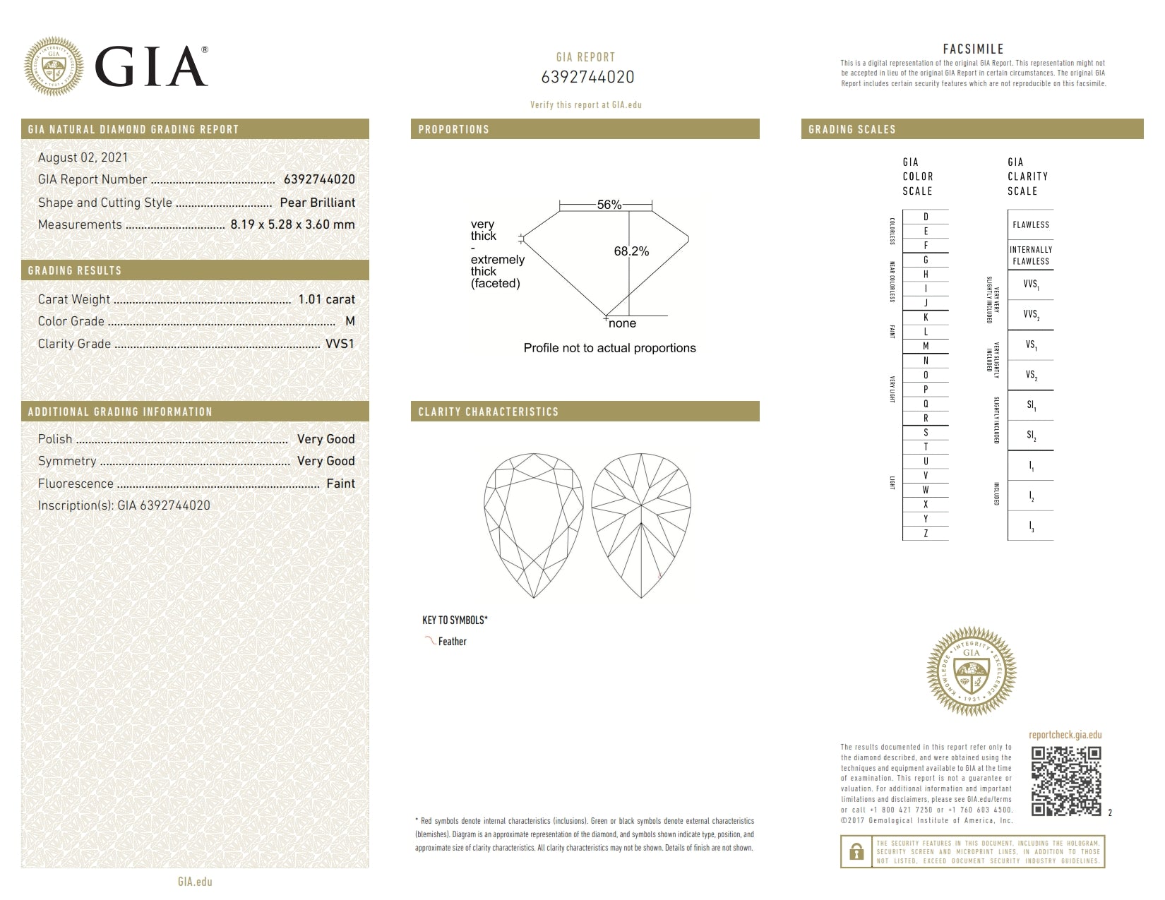 • Each of our diamonds are ethically sourced from superior rough and cut to exacting standards by our master gem cutters. This diamond is 1.01ct in a pear shape brilliant cut with a color of M and clarity of VVS1. It is 8.19 - 5.28 x 3.60 with a depth of 68.2%.