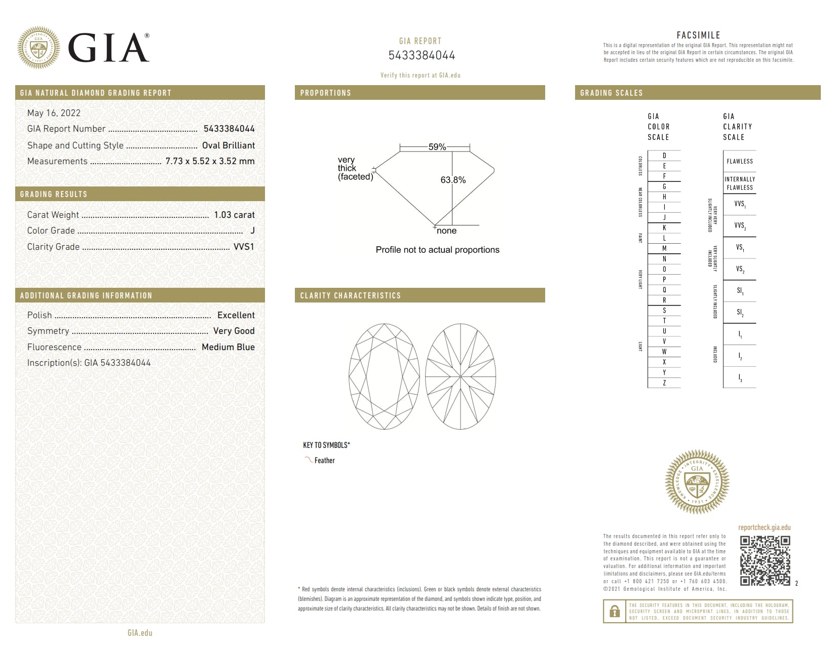 • Each of our diamonds are ethically sourced from superior rough and cut to exacting standards by our master gem cutters. This diamond is 1.03ct in an oval shape brilliant cut with a color of J and clarity of VVS1. It is 7.73 - 5.52 x 3.52 with a depth of 63.8%.