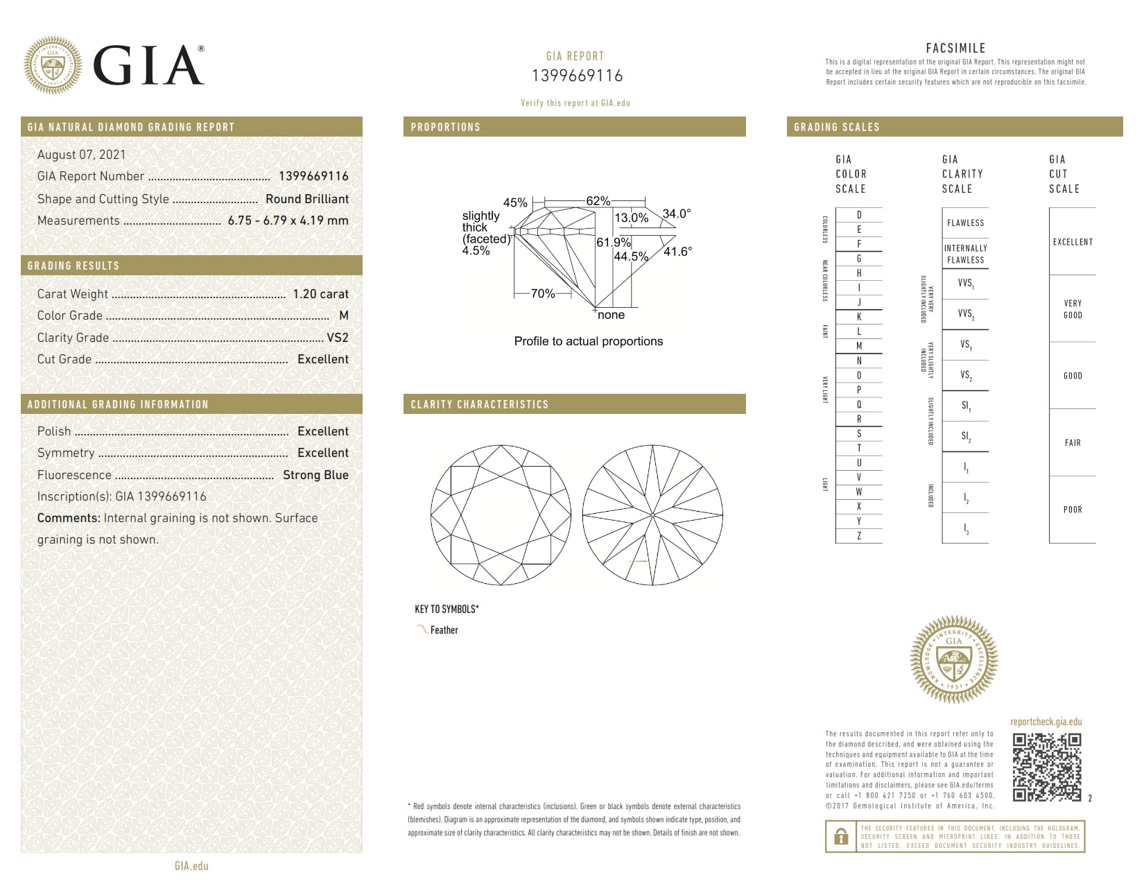 • Each of our diamonds are ethically sourced from superior rough and cut to exacting standards by our master gem cutters. This diamond is 1.20ct in a round shape brilliant cut with a color of M and clarity of VS2. It is 6.75 - 6.79 x 4.19 with a depth of 61.9%.