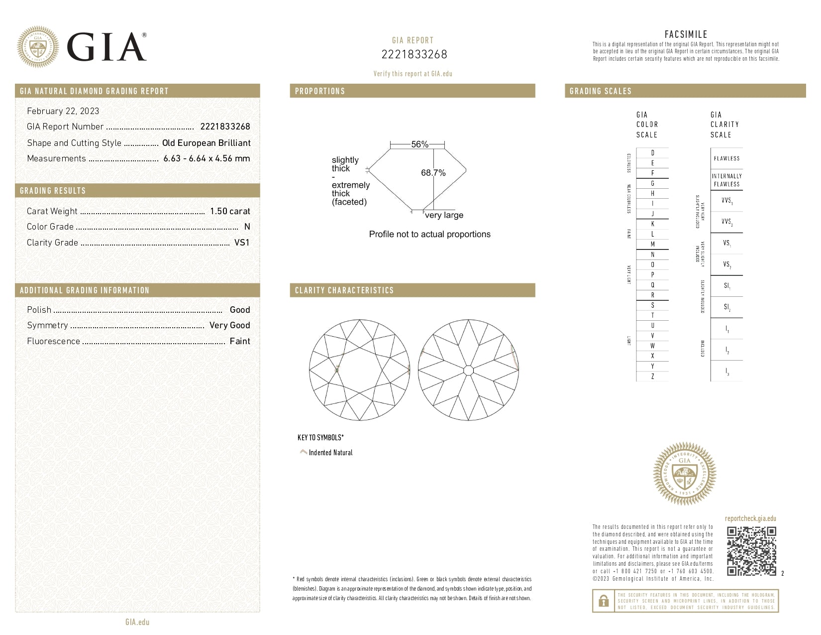 • Each of our diamonds are ethically sourced from superior rough and cut to exacting standards by our master gem cutters. This diamond is 1.50ct in a round shape old european cut with a color of N and clarity of VS1. It is 6.63 - 6.64 x 4.56 with a depth of 68.7%.