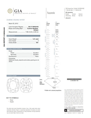 • Each of our diamonds are ethically sourced from superior rough and cut to exacting standards by our master gem cutters. This diamond is 1.81ct in a cushion shape brilliant cut with a color of J and clarity of VS1. It is 7.58 - 6.44 x 4.46 with a depth of 69.3%.