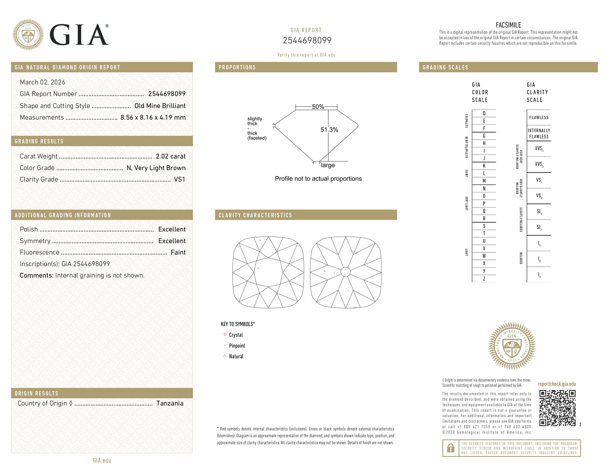• Each of our diamonds are ethically sourced from superior rough and cut to exacting standards by our master gem cutters. This diamond is 2.02ct in a cushion shape old mine cut cut with a color of N and clarity of VS1. It is 8.56 - 8.16 x 4.19 with a depth of 51.3% and is certified by GIA. This diamond originates from Tanzania.